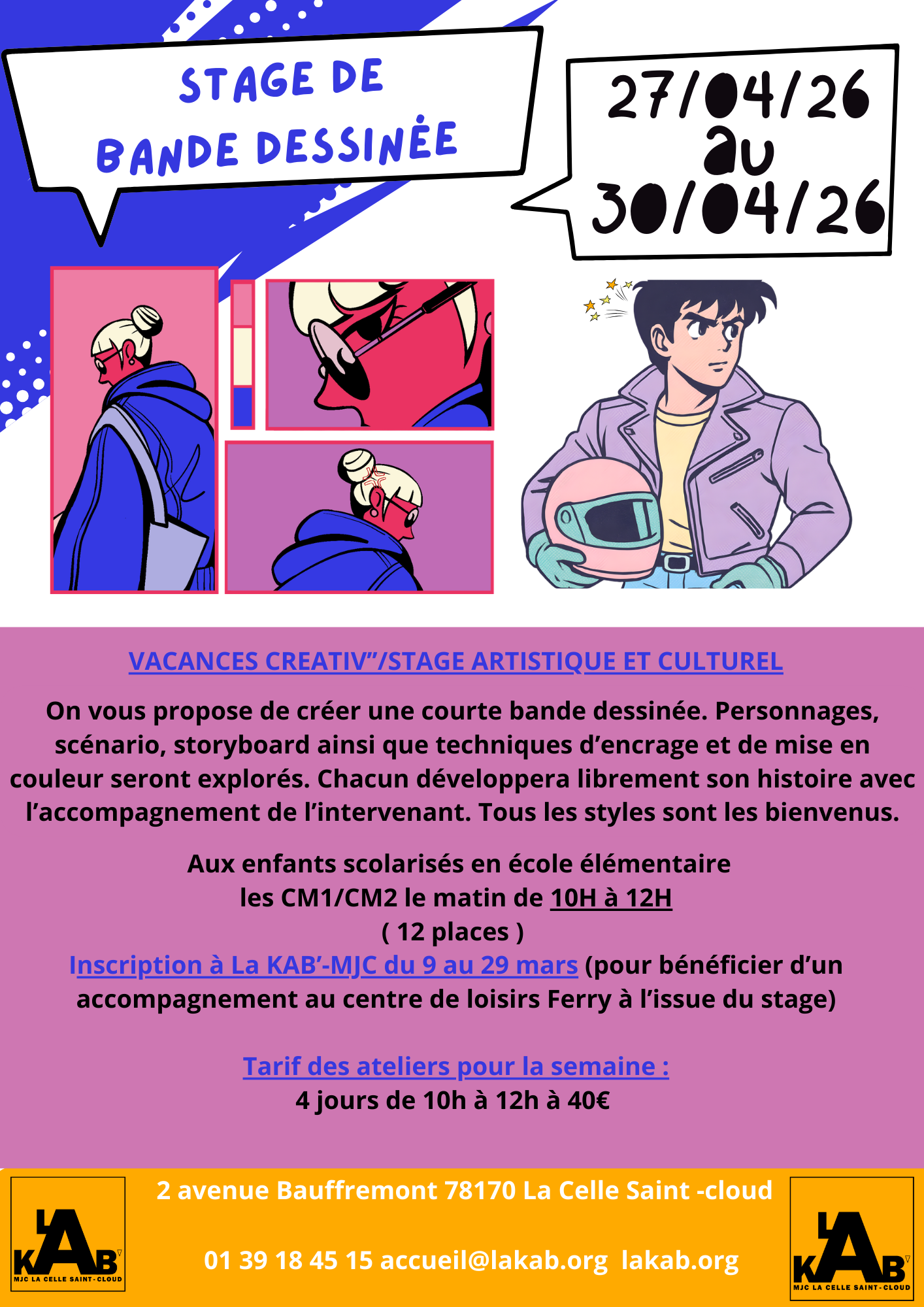 Concerts et manifestations Plus d'infos et réservations Activités culturelles et sportives Plus d'infos et inscriptions Agenda de la KAB' 21 mars 2026 Concert Metal Black Bomb A + Joke Billetterie 28 mars 2026 Rocky lyrique créature show Heure Exquise Plus d'infos Samedi 11 avril 2026 Soirée brésilienne Avec Joia Réservations Vendredi 17 avril 2026 Jam session Animée par Cyrille Vannier Infos Les rdv de La KAB' du 10 au 28 mars 2026 Exposition photographies Antoine Bril Infos Lundi 13 avril 2026 Fresque de l'alimentation Avec le club éco-citoyen Infos Du 27 au 30 avril 2026 Stage BD Avec Quentin Aubé Réservations 20 et 21 avril 202 Stage street art Stage 11/15 ans Réservations Activités Studio musique Agenda Contact Règlement des activités